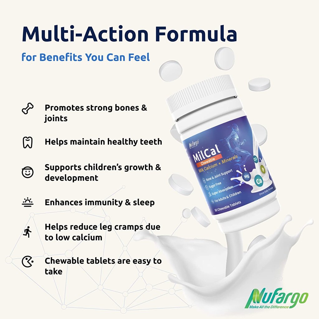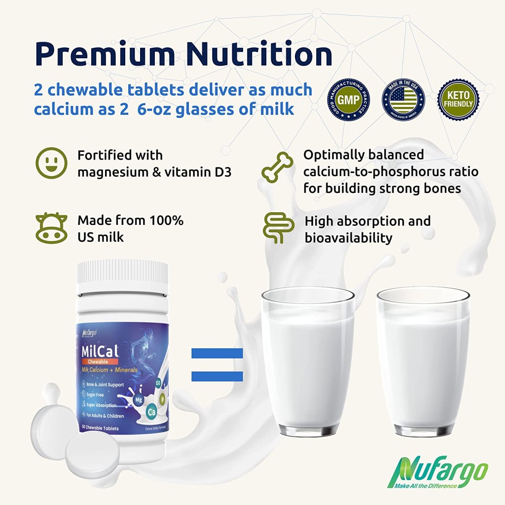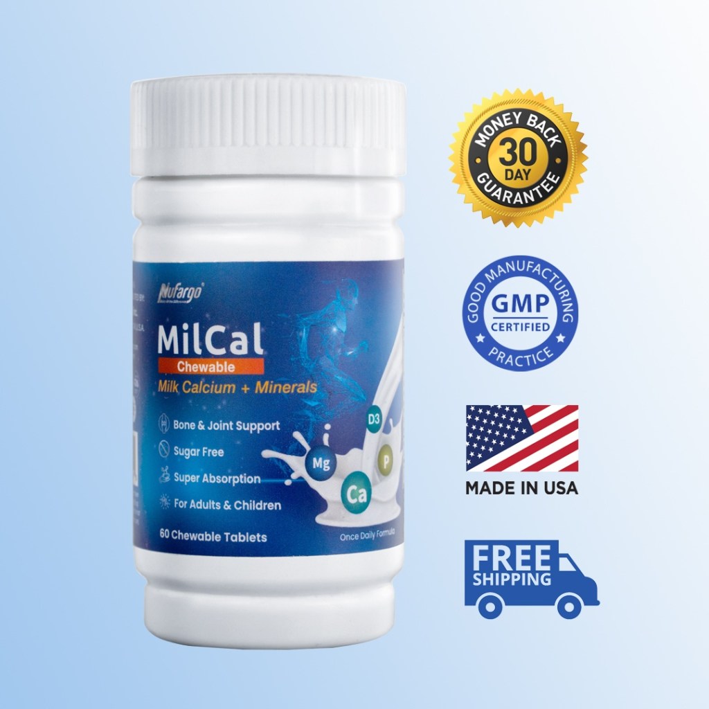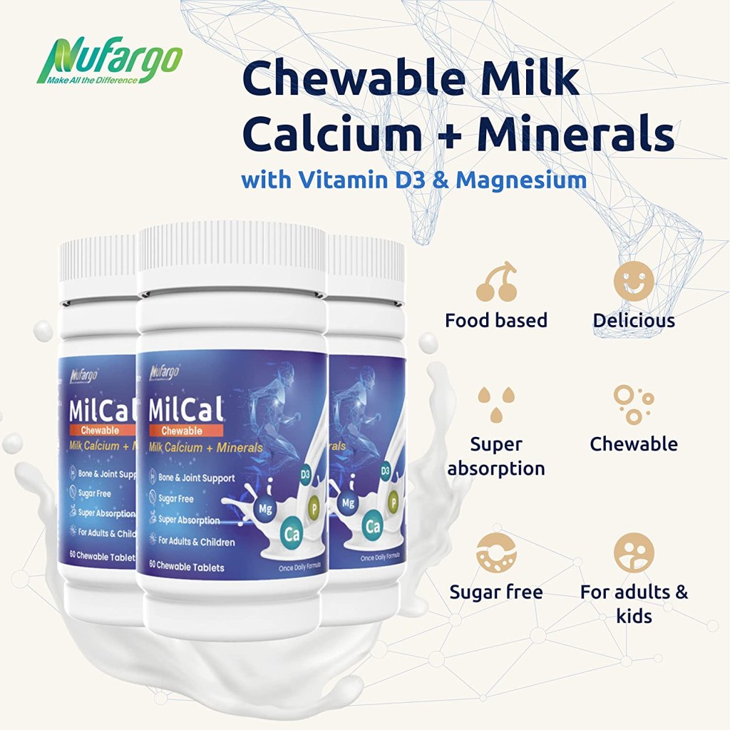 NuFargo offers a chewable, food-based calcium supplement ideally suited for both adults and children. MilCal is an advanced milk mineral extract made from pure US milk, enriched with magnesium and vitamin D3. Its perfectly balanced mineral composition is optimal for building strong bones and teeth. It also helps reduce leg cramps associated with calcium and magnesium deficiency. MilCal’s natural calcium is superior in absorption and bioavailability, with a great taste the whole family will enjoy.